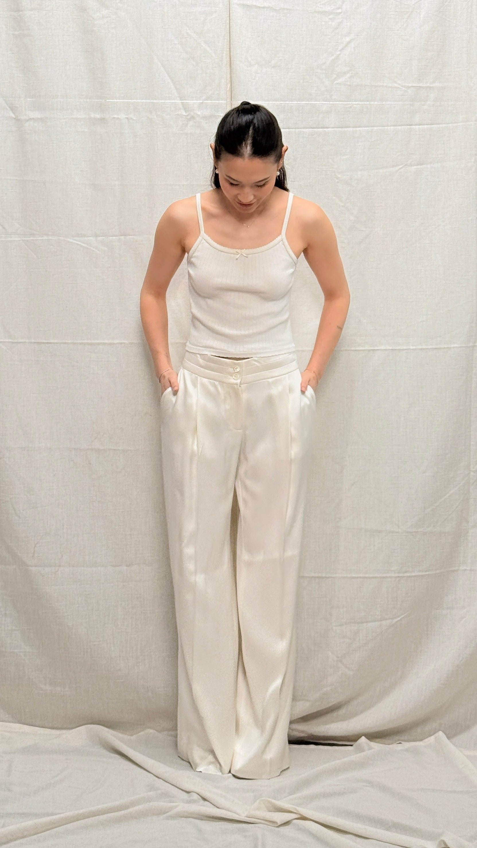 Full length ivory silk pants with a beautiful sheen to them. Good condition - some minor snags but unnoticeable when worn.