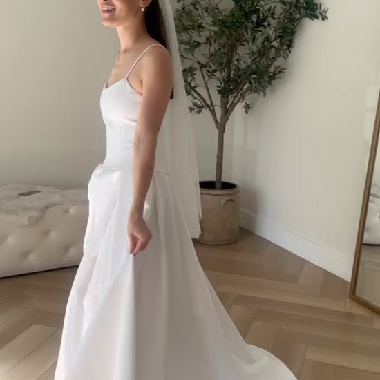 Redesigned vintage Jim Hjelm drop-waist gown with pleats. Very good condition - no noticeable flaws. White / light ivory matte satin material.